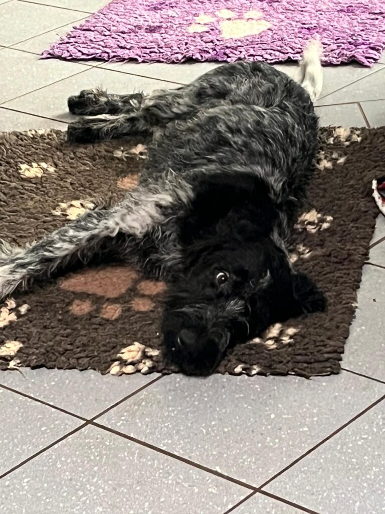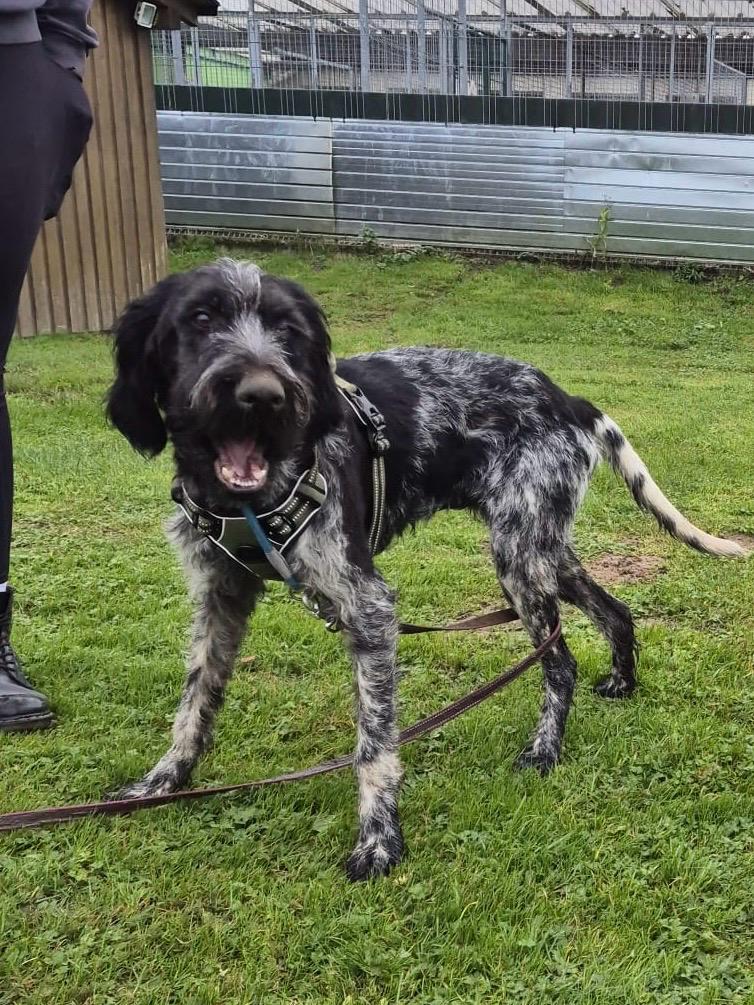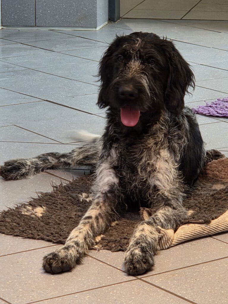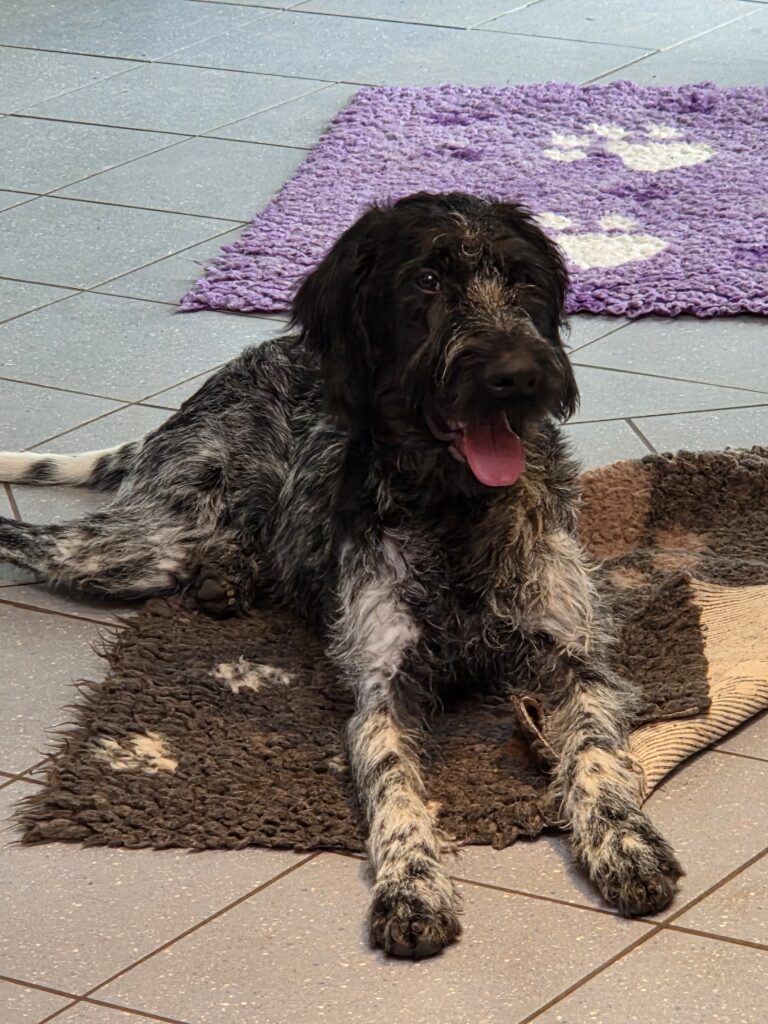 Der junge Rüdegehört zur Rasse der Deutsch Drahthaar Rasse und ist ein Jagdgebrauchshund. Populärer sind die Hunde in der Farbe braunschimmel, bei Gustav handelt es sich allerdings um einen Schwarzschimmel Rüden.