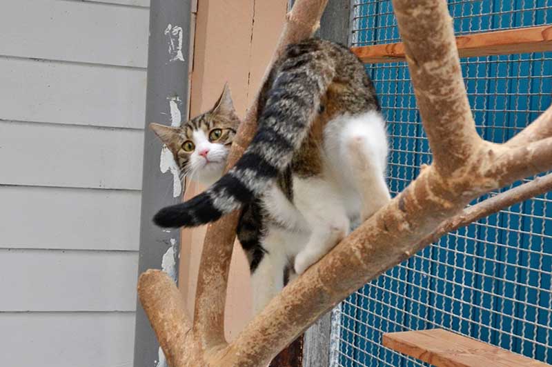 Jede Katze hat eine gemütlich eingerichtete Box mit Körbchen sowie Futter- und Wassernäpfen. Über eine Katzenklappe kann sie einen Auslauf erreichen, in dem Kratzbäume und Klettermöglichkeiten für Abwechslung sorgen. Die Boxen sind mit Fußbodenheizung ausgestattet.