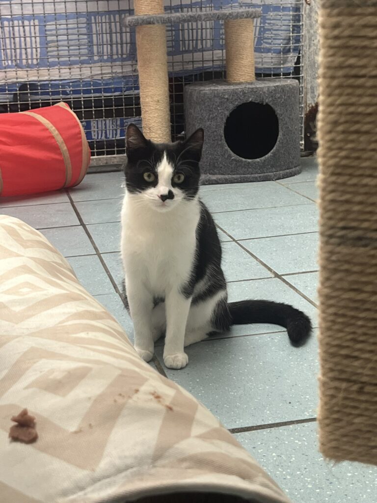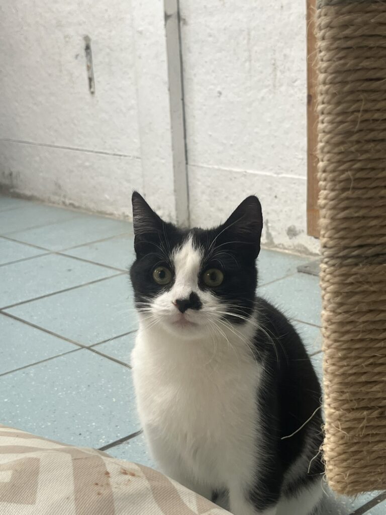 Nachdem sie den Kleinen liebevoll aufgezogen hat, lebt sie bei uns in einem Raum mit gleichaltrigen Katzen, mit denen sie sich gut versteht. Zu Menschen ist sie noch etwas scheu, wird aber täglich zutraulicher.